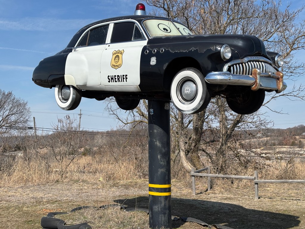 Rt 66 goes through three little towns in Kansas: Galena, Riverton and Baxter Springs. I stopped in the first and last. The town of Galena began in 1876 when Galena, a natural mineral form of lead sulfite, was first discovered there. It is the oldest mining town in Kansas, incorporated in 1877. The first stop was a facsimile of the 1949 Mercury police car that served as the Sheriff of Radiator Springs in the 2006 animated film “Cars.”