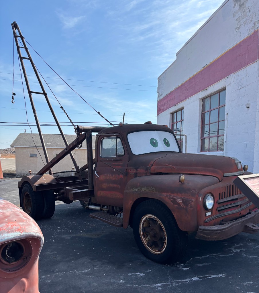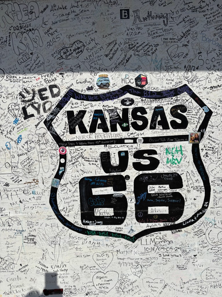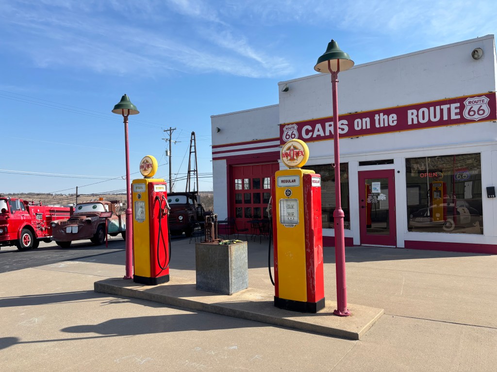 Around the corner, was an old Kan-O-Tex service station first opened in 1934. When director John Lasseter and story writer Joe Ranft were doing research for the movie “Cars”, they asked Rt 66 enthusiast Micheal Wallis to guide them on Rt 66, which he did for months. (They enjoyed him so much they asked him to voice the Sheriff in the movie, and he autographed the car pictured above). When he took John and Joe to Galena, they saw an old tow truck against the wall next to the old Kan-O-Tex station. It had a long crane because it was used in the mines. This became the inspiration for Tow Mater, the tow truck in the movie. In 2007 the old service station was purchased and restored by four local women who wanted to renew interest in Kansas’ small portion of Route 66. Today the station is “Cars on the Route,” an homage to the Pixar movie. As I was taking a picture, the daughter of one of the women came out, told me the story about Mater and showed me around. She has lived in Galena nearly her entire life and said the movie “Cars” has renewed interest in Rt 66 and thereby Galena. Her town had fallen on hard times and is now thriving.