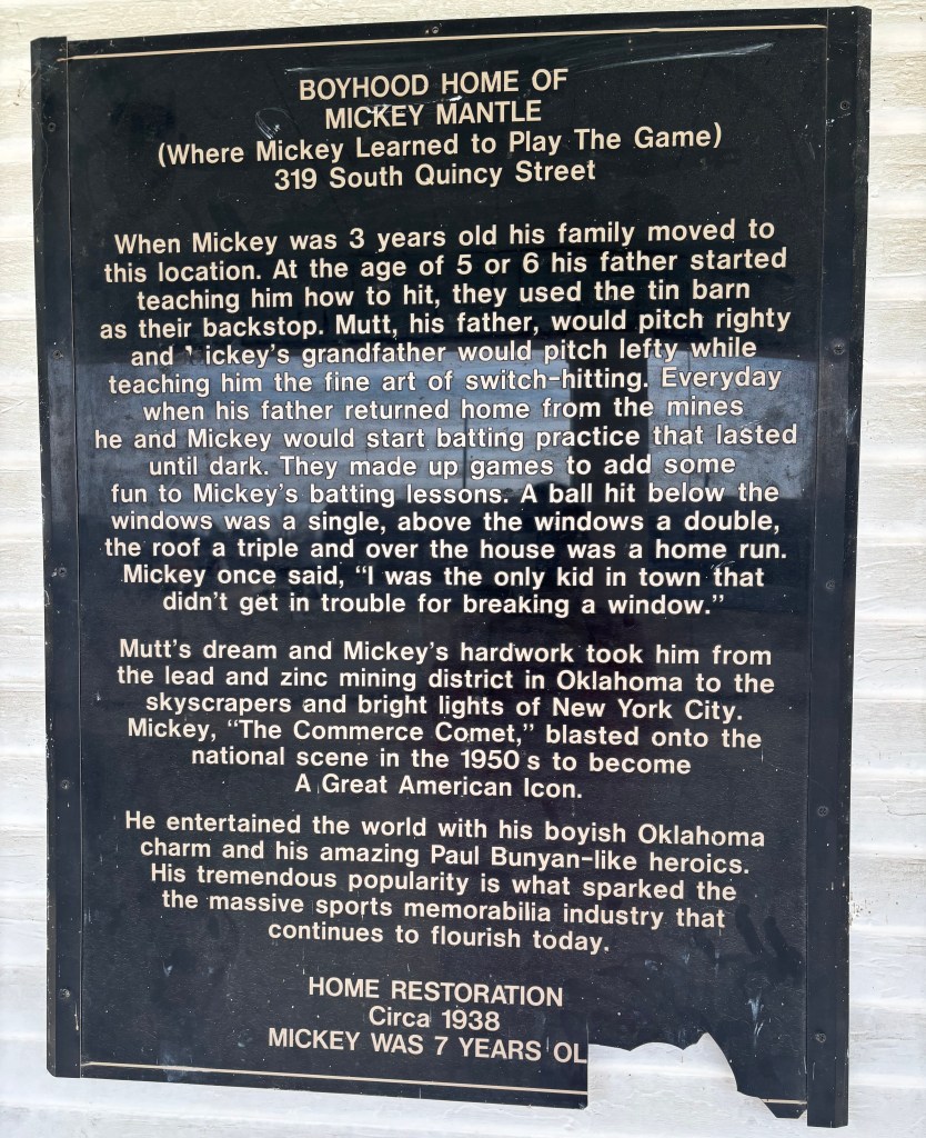 Commerce had something to show me that was not in the guidebook. As I was leaving town, there was a tiny blue sign that said,” Mickey Mantle’s Boyhood Home” and an arrow pointing down a side street. Knowing I had my Mona endorsed pepper spray with me in case I should run into trouble going off route, I made the turn. And there it was. Did you know he was called “The Commerce Comet”? I did not, nor did Rod, nor did my mother, nor do most people who live outside of Commerce, Oklahoma, I suspect.