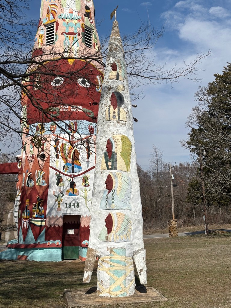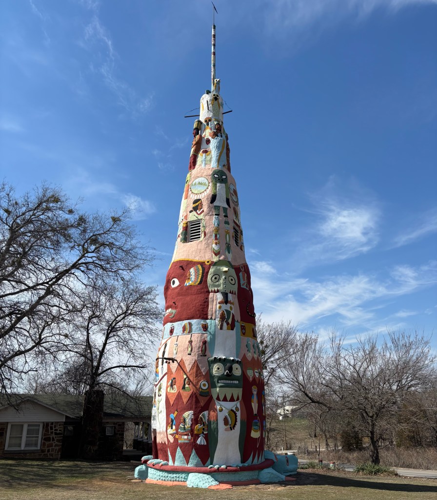 Between 1937 and 1963, Ed Galloway (1880-1963) built a visual art environment as a monument to the American Indian. He constructed 12 structures found at the Ed Galloway’s Totem Pole Park almost entirely with his own tow hands. The Native American motif speaks to the history of the land of Oklahoma which was known as Indian Territory before the state of Oklahoma was established in 1907 as well as the shifting social realities of western expansion. It was here that the Trail of Tears terminated, depositing tribes from the south eastern United States in Oklahoma. Ed believed that the original inhabitants of this land should be honored and remembered, and he set out to do just that. The largest totem rises from the back of an enormous turtle which was carved from an outcrop of sandstone evoking the indigenous term ‘Turtle Island’ or North America. It features over 200 hand sculpted bas-relief creatures and Native American portraits. It is estimated that 28 tons of cement, 6 tons of steel, and 100 tons of sand and rock comprise the 90 foot tall structure that took Ed 11 years to complete. What was more amazing to me is that he collected the sand for the cement from the creek bed running on the west side of his property and used a hand crank drill to cut the rocks to be shaped. (Information sourced from Erin Turner, Site Curator & Restoration Artist, 2021)