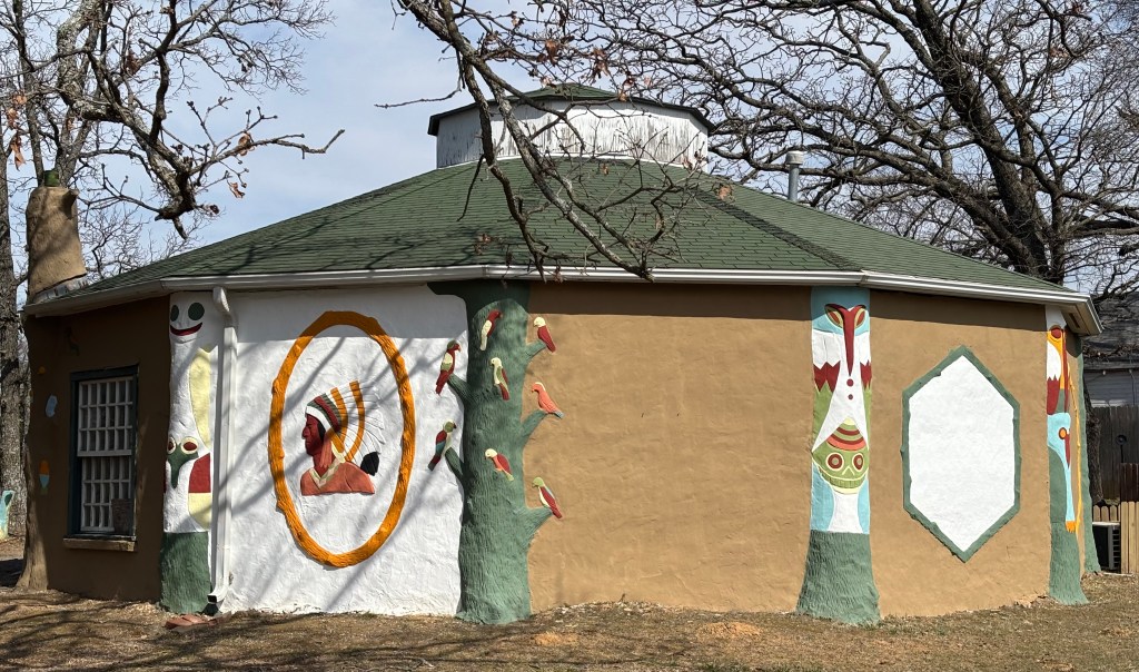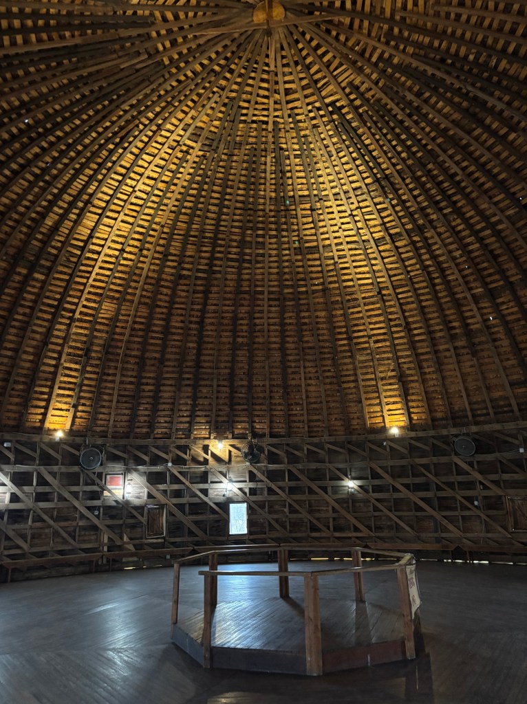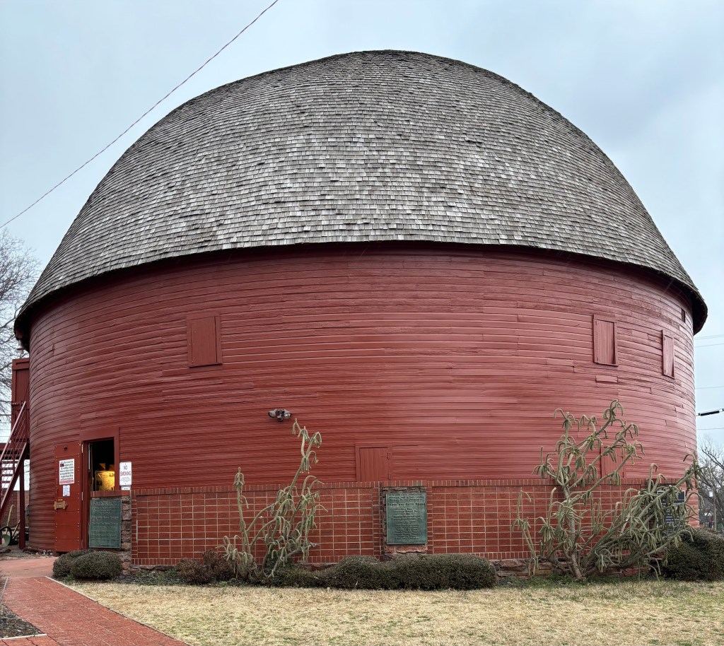 As I had missed the open window of the Rock Cafe, I decided to check the times for the next stop. When I plugged it in the GPS, I was informed I would arrive 10 minutes before it would close. So instead of using Route 66, I got on the interstate, knowing it would be quicker. Apparently, folks in Oklahoma need to get from here to there at speed. The interstate speed limit is 80, so I decided to go 85, and people were zipping past me. It is 65 in construction zones! Needless to say I arrived at Round Barn before it closed. Round Barn was built by local farmer William Harrison Odor in 1898. He made the rounded walls and roof rafters by soaking green native bur oak boards and bending them into curves. It is 60 feet in diameter and 43 feet tall. William figured if the barn was round, the extreme winds of tornadoes would strike and flow around it instead of through it. In the early 20th century, round barns were said to be “cyclone-proof”, but there is no scientific evidence to support this. However, the barn is still standing, it can be rented for events, and every week it hosts Saturday Morning Music Sessions.