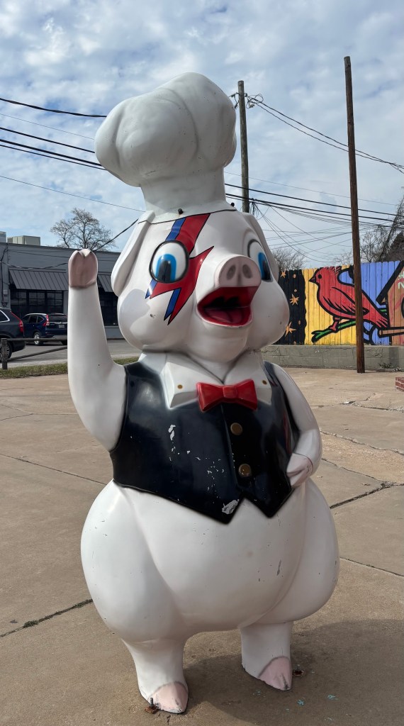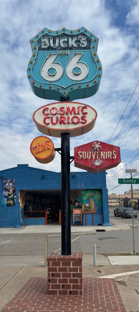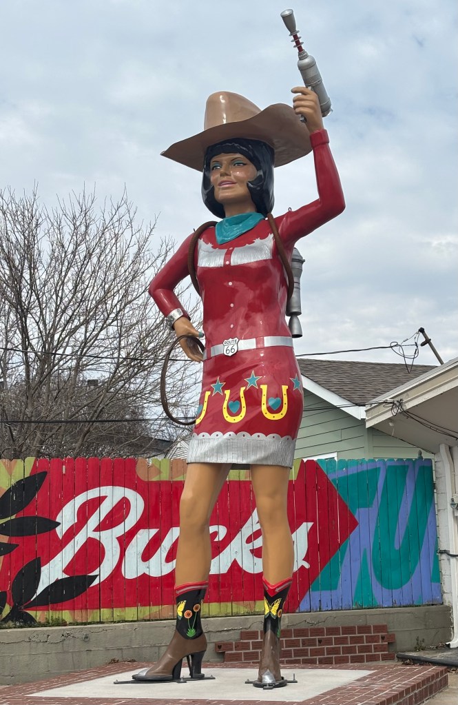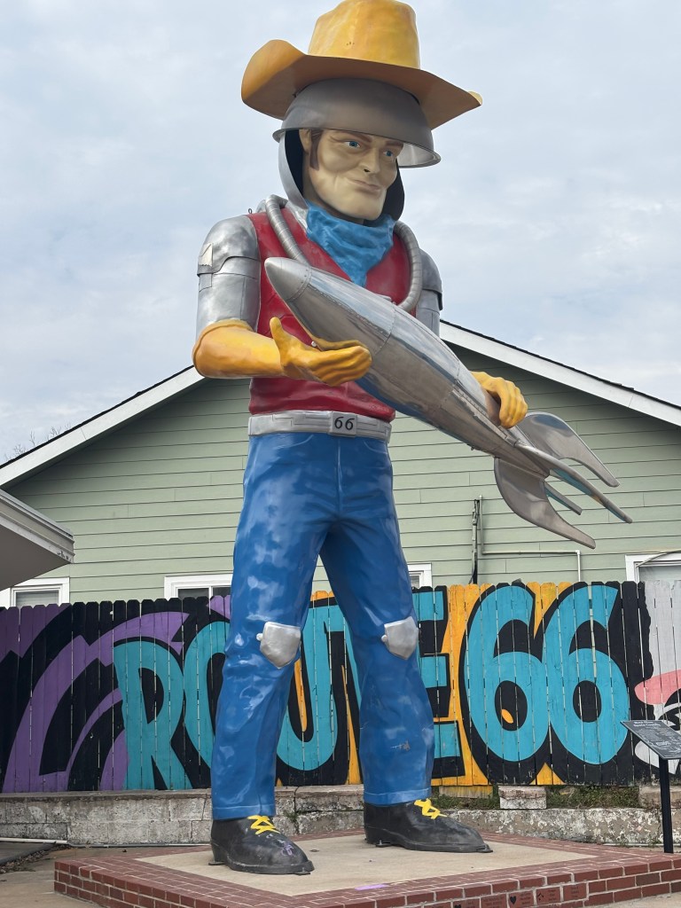 In Tulsa, in the former site of a 1950s PEMCO gas station, was Buck Atom’s Cosmic Curios. If you want to celebrate the “magic of Route 66 with apparel, toys, souvenirs, art, jewelry, and more” this is the place for you. So that you don’t miss it, there are two giant statues, Buck Atom, the Space Cowboy, and Stella, the Space Cowgirl. There is also Piggy Stardust, but he is not giant. Route 66 loves giant things.