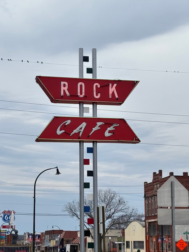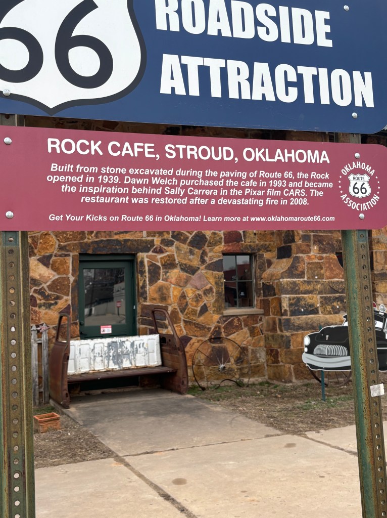John Lasseter and the research team for Pixar’s movie “Cars” visited the Rock Cafe in 2001 and upon meeting owner Dawn Welch began developing the character Sally Carrera. They made multiple visits from 2001-2005. It was built in 1936 from the stone excavated during the paving of Rt 66 and opened in 1939. The neon sign was installed in the late 1940s. I was so disappointed that it closed at 2 pm and I was there at 3: 15, I forgot to take a picture of the entire cafe. You can see some of the stone behind the information sign, though. I was also hungry as I had planned on eating there. I am sure this added to my forgetfulness.