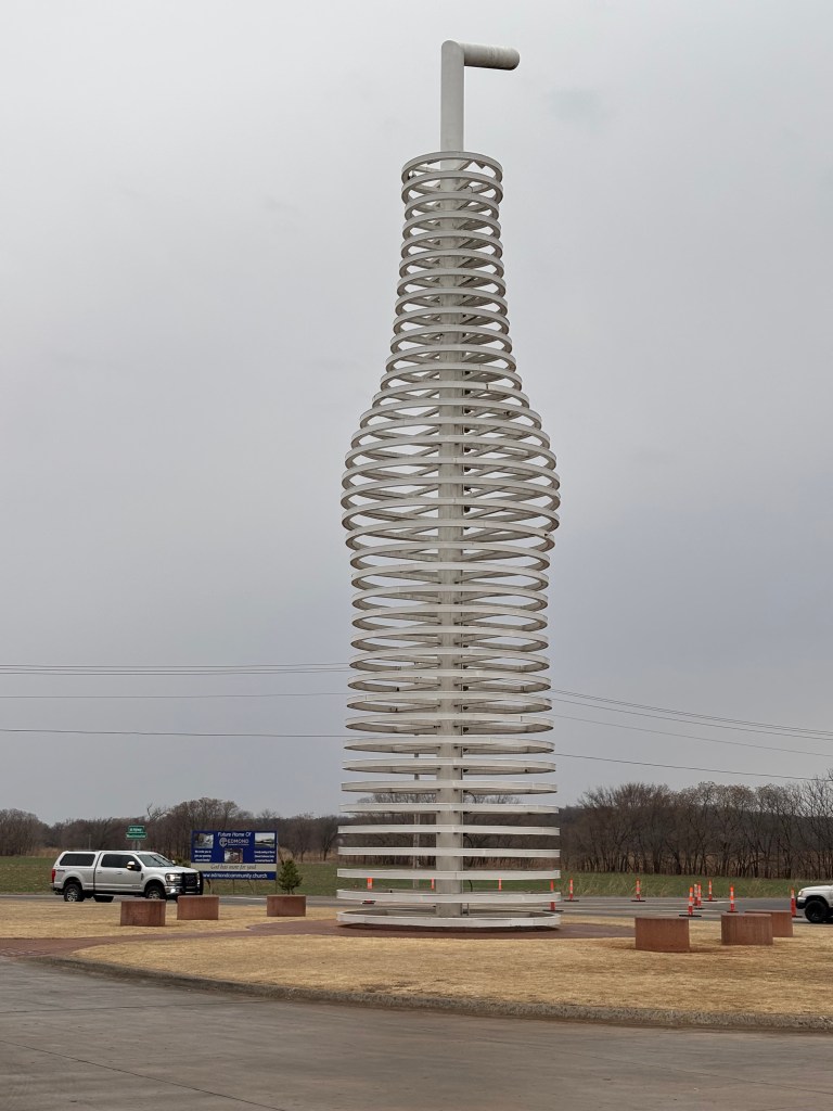 As I was heading to Oklahoma City, I came upon my last stop of the day, Pops Soda Ranch. The specialty beverage maker offers a signature collection of 700 kinds of soda, sparkling waters, and ice-cold refreshments. The structure, which opened in 2007, incorporates a cantilevered truss extending 100 feet over the gas pumps and a parking area. The roadside sign is a 66 foot tall soda bottle. Alas, the main area was closed for renovations so I was unable to purchase a bottle of bacon flavored soda, which I thought would be “Eww, Munger Moss”, but fun to have. I did however, purchase a hat with the soda bottle logo on it so all was not lost.