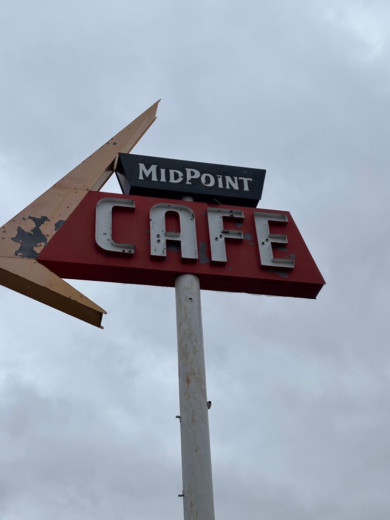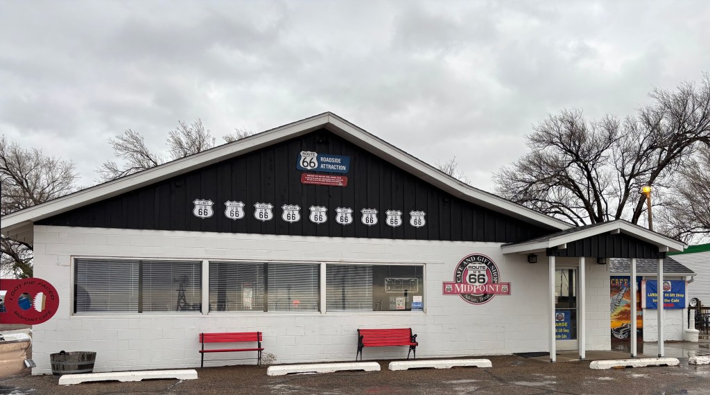 My first stop was Midpoint Cafe in Adrian TX. It is exactly halfway between Chicago and Santa Monica on Route 66. Opened in 1928, it is supposedly the oldest continuously operated eatery on Rt 66 between Amarillo, TX and Tucumcari, New Mexico. It went through many iterations: Zella’s Cafe, Jesse’s Cafe, Peggy’s Cafe, Rachel’s. In 1990, Fran Houser purchased the cafe and named it Adrian’s Cafe. The current name was adopted in 1995 on the advice of US Route 66 Association Founder Tom Snyder. Fran Houser reported, “Tom called me one day. He said, ‘Kid, you better do something because you are at the midway point of Route 66. You need to change that name.’” So she did and added the slogan, “When you are here, you are halfway there”. In the movie “Cars”, the characters of Flo, Mia, and Tia are based on Midpoint Cafe owner Fran Houser and two servers at the cafe. Flo, Mia, and Tia work at “Flo’s V-8 Cafe”. Fran retired from the cafe in 2012.