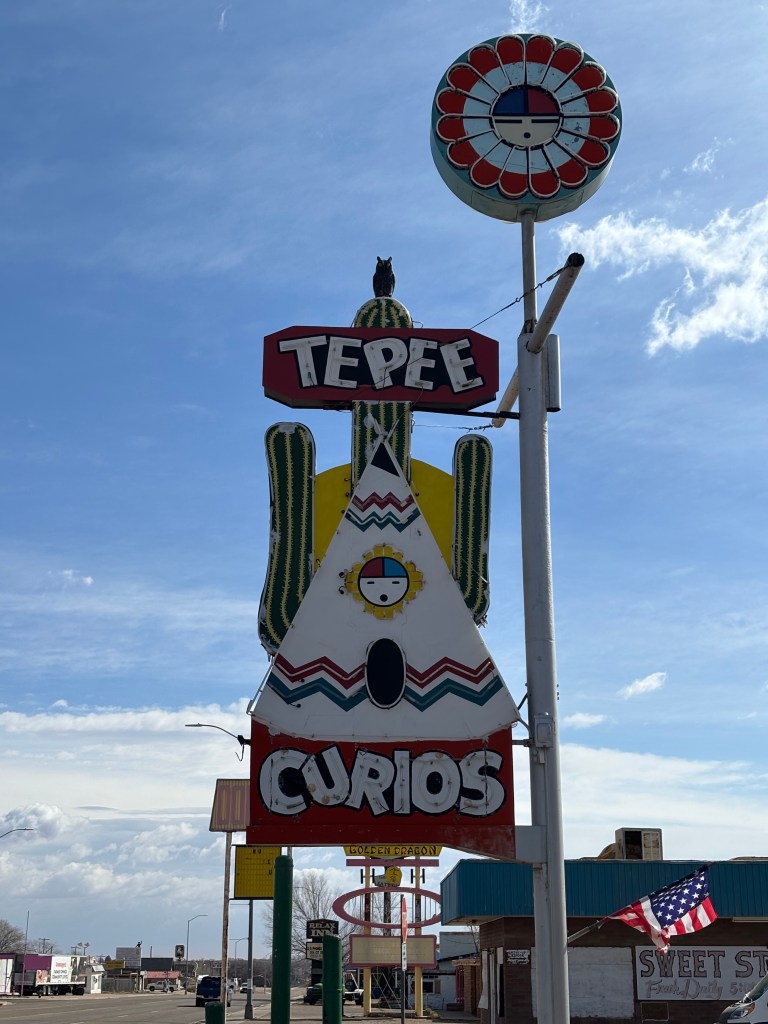 Tee Pee Curios, built in the 1940s, is one of the only remaining teepee curio shops in New Mexico. Apparently, these were very popular throughout the southwest. My grandparents lived in Arizona and I can remember visiting these shops for souvenirs. When I was 9, I bought an ‘Apache Tear’ ring at one of these shops. This was a popular name for rounded obsidian pepples. The name came from a Native American Apache tribe legend: about 75 Apache warriors and the US Calvary fought on a mountain overlooking what is now Superior, Arizona in 1870. Facing certain defeat, the warriors rode their horses off the mountain to their deaths rather than be killed. The warriors wives and families cried when they heard of the tragedy, their tears turning to stone upon hitting the ground.