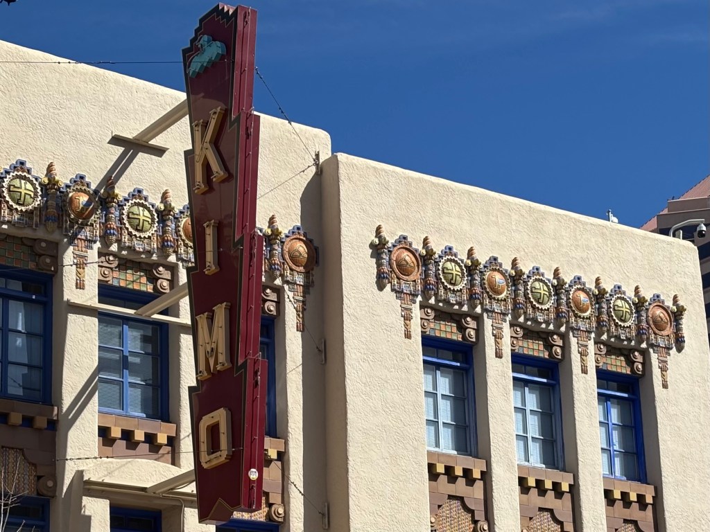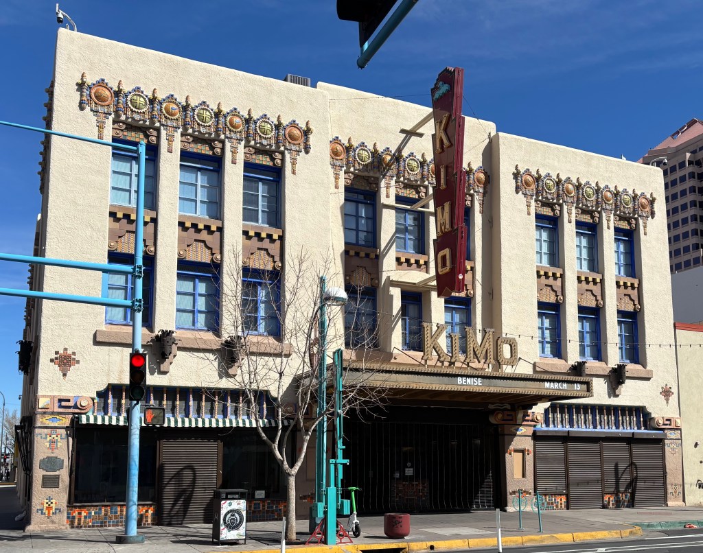 The KiMo Theatre, a Pueblo Deco movie theater, first opened on Sept. 19, 1927. Pueblo Deco was a short lived architectural style that combines elements of Art Deco with the region’s Pueblo and Territorial architecture. Pueblo Deco appeared at a time when movie-crazy communities were constructing palatial theaters based on exotic models such as Moorish mosques and Chinese pavilions. Native American motifs influenced only a handful of these designs and the KiMo Theatre is a stunning example.